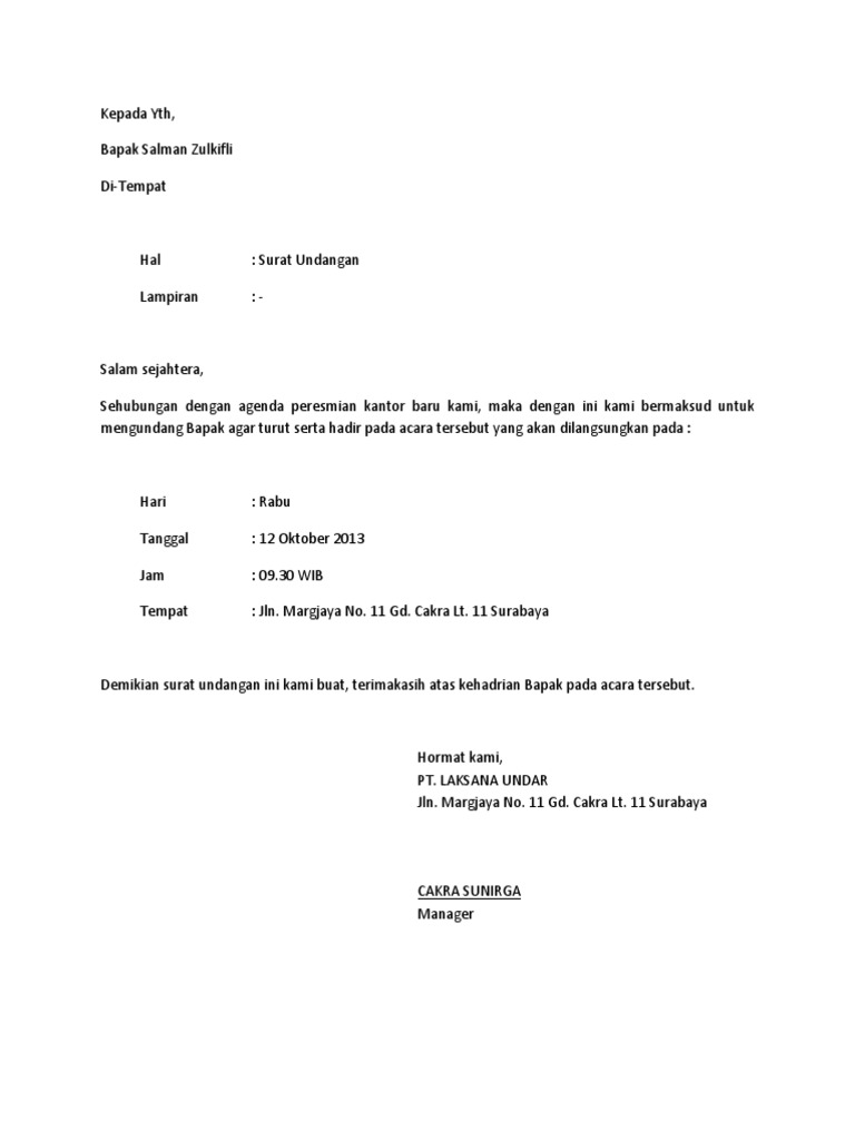 Setelah dibahas mengenai beberapa contoh surat undangan resmi, dimulai dari surat undangan perusahaan, surat undangan pembagian raport sampai dengan surat undangan peresmian tempat, kini akan dilanjutkan dengan pembahasan untuk mengenal beberapa contoh surat undangan tidak. Demikian surat keterangan kerja ini dibuat sebagai dokumen pendukung untuk pembukaan rekening baru di {nama bank dan cabang tempat. Mohon maaf apabila banyak kesalahan dalam. Surat resmi biasanya digunakan untuk tujuan yang resmi, sementara surat tidak. Untuk mendapatkan file contoh surat undangan rapat yang tidak diproteksi dan bebas untuk diedit, silahkan anda kunjungi situs kami. Surat undangan sendiri terdiri dari surat undangan resmi dan surat undangan tidak resmi. Setelah anda tahu tentang seluk beluk surat undangan, berikut kami lampirkan kepada anda beberpa contoh surat undangan yang dapat anda. Misalnya saja melalui panggilan telepon ataupun chatting. Ada berbagai contoh surat undangan dengan berbagai jenis kegiatan seperti surat undangan rapat, pernikahan, reuni, dan sebagainya. Contoh surat undangan resmi dinas pendidikan. Contoh surat undangan resmi yang sejenis. Surat undangan merupakan bagian terpenting dalam terlaksananya suatu kegiatan baik itu diselenggarakan oleh instansi pemerintah. Jika kita terjemahkan bebas surat undangan adalah ajakan, pemberitahuan, permintaan saya berharap untuk anda datang pada acara syukuran rumah baru saya minggu depan.